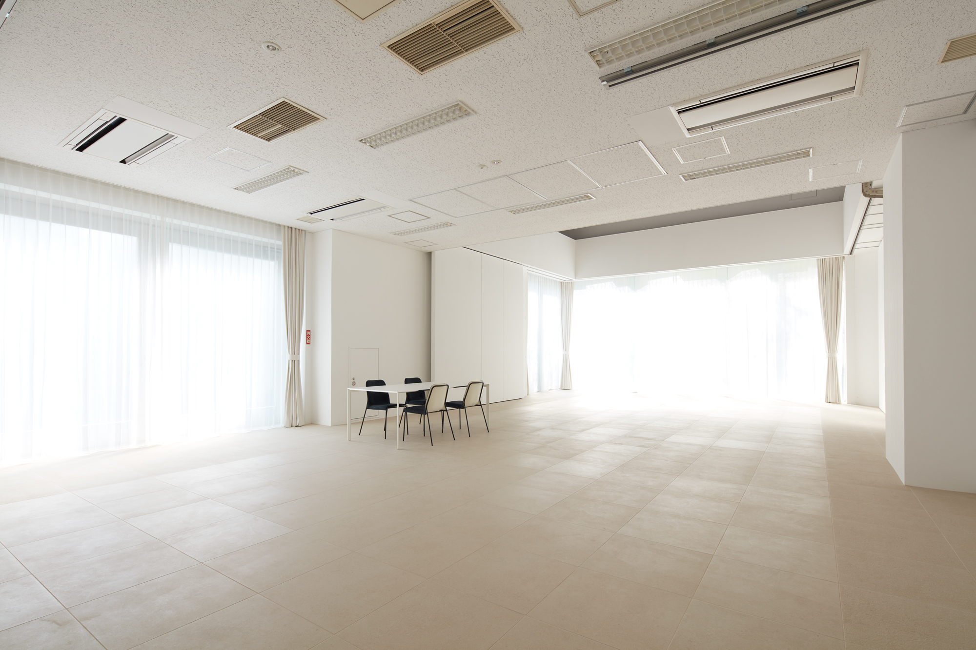 皆様お待たせいたしました!ついに1.STUDIOが完成しました! ホリゾントがあった部分はガラス壁となり、壁一面から光が入ってきます。 また、カーテンとボードにより遮光することが可能で、日中でも自然光